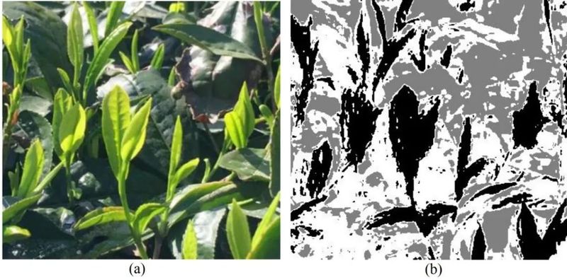 茶梢原始图像(a)与机器算法聚类结果(b)