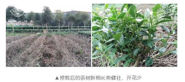 2、科学修剪:秋茶采完后及时修剪边枝、侧枝及弱枝,可有效减少花果枝。在春茶后(5-6月)对茶树进行修剪,减少花芽着生有效部位,有效抑制茶树开花。茶树经修剪后一方面有利于地上部与地下部的平衡,体内养料主要供给新生营养芽生长,使生殖器官需要的养分供给减少,可减少成花。另一方面修剪还改变了茶树体内的碳氮比,剪去细弱老化、含碳量高、养分运送困难的上部枝梢从而促进营养生长,抑制生殖生长。