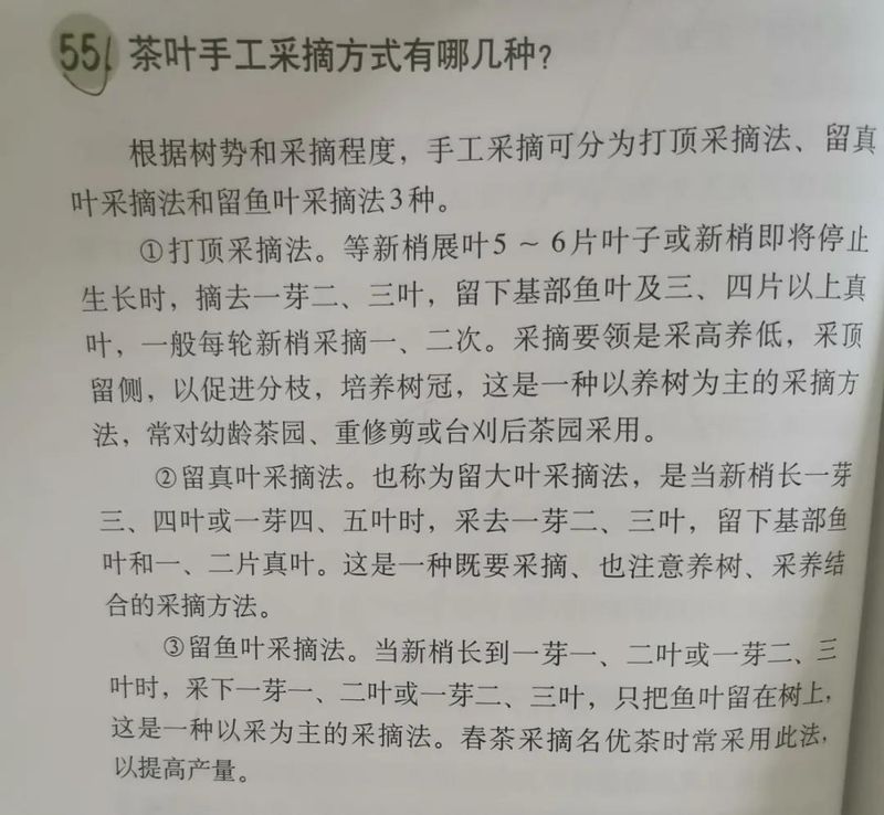 根据树势和采摘程度,手工采摘可分为打顶采摘法、留真叶采摘法和留鱼叶采摘法3种。