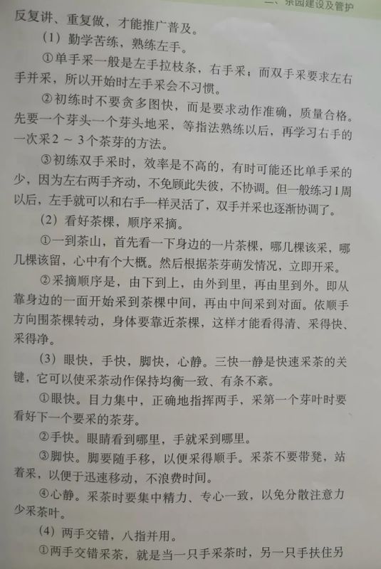 (3)眼快,手快,脚快,心静。三快一静是快速采茶的关键,它可以使采茶动作保持均匀一致、有条不紊。