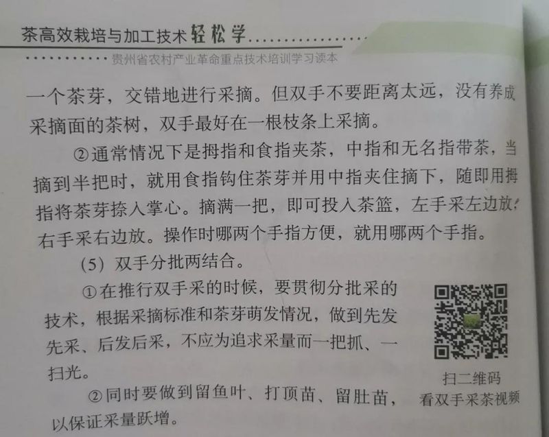 ①在推行双手采的时候,要贯彻分批采的技术,根据采摘标准和茶芽萌发情况,做到先发先采、后发后采,不应为追求采量而一把抓、一扫光。
