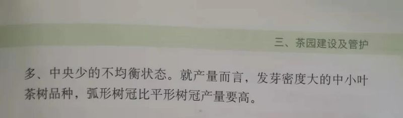 就芽叶长势看,弧形树冠面的中间与边侧各部位的新梢长势一致,形态容易维持,每年春季修剪量较小。平形树冠中央部位新梢稀而壮,长势较两侧强,每年的生长均表现出向弧形演变的趋势,因此,每年的修剪量较大。就树幅而言,弧形树冠每年可增宽5厘米左右,而平形树冠增幅较快,每年可增加24厘米左右。对于未封行的茶树来说,平形树冠有利于条树覆盖度的增加;对于封行的茶树来说,平形树冠无疑将增加行间的修剪量。就叶层分布来说,弧形树冠叶层分布优于平形树冠,弧形树冠各部位的叶层分布较均匀,平形树冠叶层分布呈两侧多、中央少的不均衡状态。就产量而言,发芽密度大的中小叶茶树品种,弧形树冠比平形树冠产量要高。