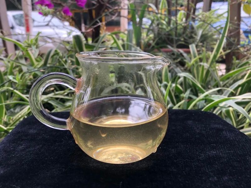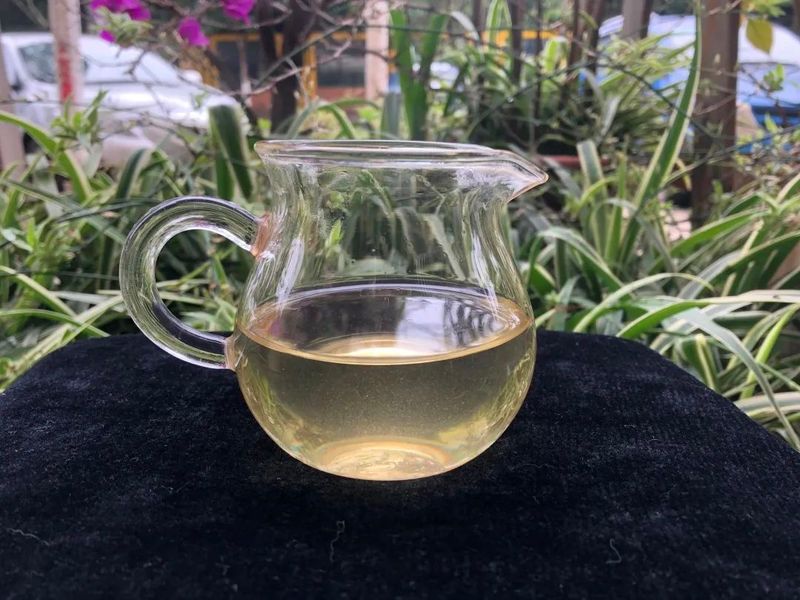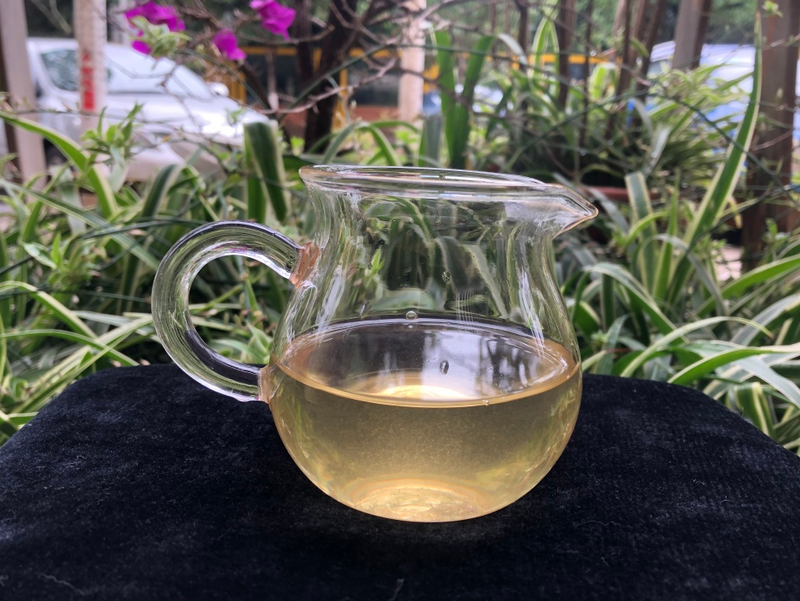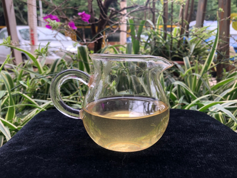 汤色呈黄绿色,透亮度稍有混浊,这是由于部分绒毛脱落悬浮在茶汤中所造成的,属正常现象,压饼存放1-2年后,就会变得很清亮了。无论茶汤香还是挂杯香都比较浓郁,香型呈蜜香中带有明显的花香,同时还带有高杆茶特有的那种野性(俗称骚香味)。