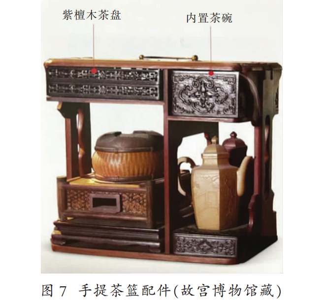 自茶圣陆羽在所作茶具二十四篇章中提出“以都篮贮之”,而后流传于世的古籍记载均尚未对茶具的收纳器具进行详细的描述。搭配乾隆竹炉的手提茶篮配件实物样形式(图7),展示的不仅是茶盘、茶具、茶壶的收纳功能,更是实现了火灶类器具便于携带,可加强因地制宜、因时制宜进行茶叶试制的可能。