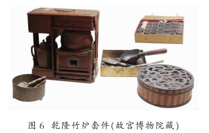 该配件符合美学需求。自明朝开始,文士们的审美,相较于前朝大有不同,提倡保持茶叶之真味,因时而异,因地制宜,顺其自然。清代的茶事更注重至精至美的茶“道”之境,“道”本就存在于事物之中。论制茶技术和饮茶方式发展,一定是与人之真实需求相结合的,自明朝朱权自创了“茶灶”一具,在《茶谱》中有了“古无此制,予于林下置之,烧成瓦器如灶样”的记载后,启发了很多文人对于“火性”器具的研究和创制。明朝张源在其《茶录》一书中就率先提及“造时精,藏时燥,泡时洁;精、燥、洁,茶道尽矣”的观点,并成为影响后人试茶最重要的指导思想之一。从保留下来的这个乾隆竹炉套件实物(图6),可以体会到乾隆皇帝对于茶事之用心,以及对“精、燥、洁”茶道审美之追求,对于当今茶艺环境、家庭环境、产品研发环境的火灶器具开发提供了指导方向,以满足未来更多样更丰富的茶人需求。