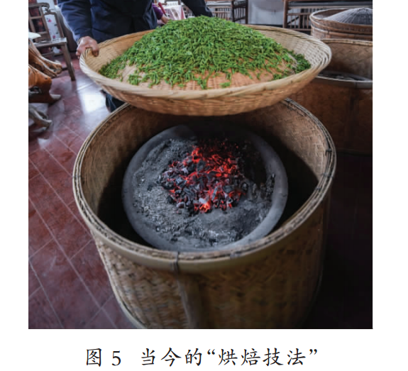 添炭盖灰提香(干燥):当茶叶含水率在20%~30%之间,进入烘焙提香操作。炉膛添加炭火,配用黄铜灶眼盖,盖上适当堆盖薄灰,再架上筒身配件,将茶叶摊放在桑树皮纸上,连纸放置于筒身配件上,文火烘至足干。(桑树皮纸的燃点高于普通纸张130~180 ℃的燃点。)