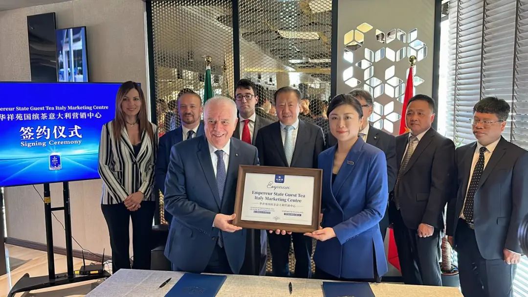 ▲华祥苑茶业与意大利国际茶文化发展基金达成战略合作协议、签订成立华祥苑铁观音国缤茶意大利营销中心