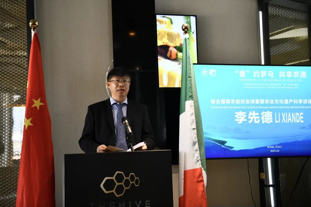 联合国粮农组织全球重要农业文化遗产科学咨询小组委员、中国农业科学院研究员李先德在致辞中表示,安溪铁观音值得起全球重要农业文化遗产光荣的称号,希望全世界的人都能够认识它、了解它、都能够品味到能喝的“香水”的滋味,希望通过这个机会,推动安溪的铁观音和意大利的葡萄酒,结成对子,开展互往和深入交流,让两国的人民和消费者通过品茶、饮酒获得健康、知识和快乐。