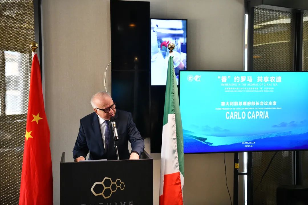 意大利前总理府部长会议主席卡罗•卡普里亚发表致辞,他首先代表意大利国际茶文化发展基金会热烈欢迎远道而来的中国朋友。他说,中国和意大利的交流合作源于两千多年前,有句古话叫“条条大道通罗马”,中国和意大利都是世界文化遗产最多的国家,通过茶文化的交流与沟通,将创造两国合作共赢的局面。