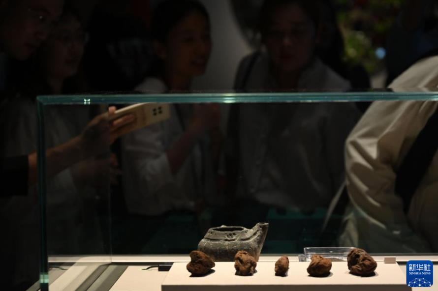 9月1日,嘉宾参观浙江余姚田螺山遗址出土的人工种植茶树根。新华社记者 金良快 摄