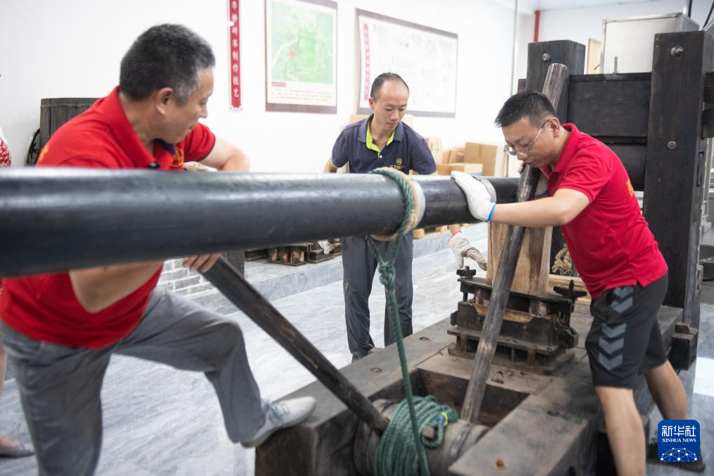 9月9日,工作人员在位于羊楼洞古镇的赵李桥砖茶制作技艺传承馆展示古法压茶。