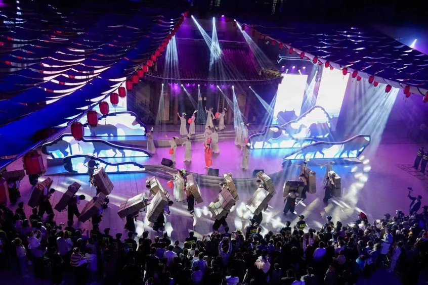 活动期间,以茯茶文化为核心主题的《花映金茯》主题科技互动光影剧上演。该剧将多媒体手段和动作捕捉技术相结合,高度定制化的3D Mapping建筑投影呈现,实现了虚拟与现实的有机转换和沉浸式体验。现场更有大型沉浸式舞蹈演出,虚实交汇、虚实共生,游客可深度参与其中。