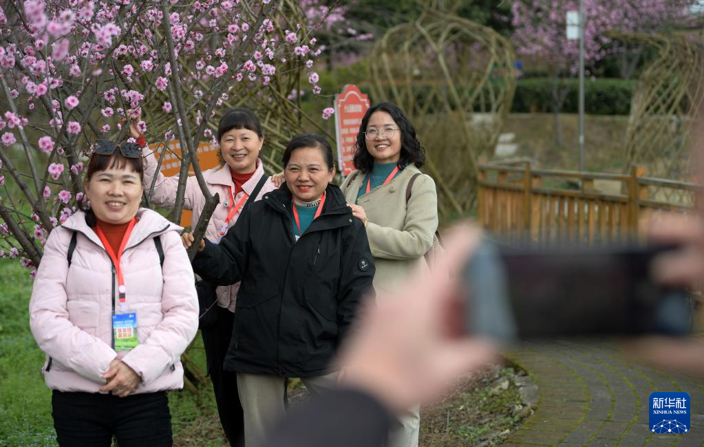 3月16日,游客在贵州省凤冈县永安镇田坝社区生态茶园基地合影。新华社记者 杨楹 摄