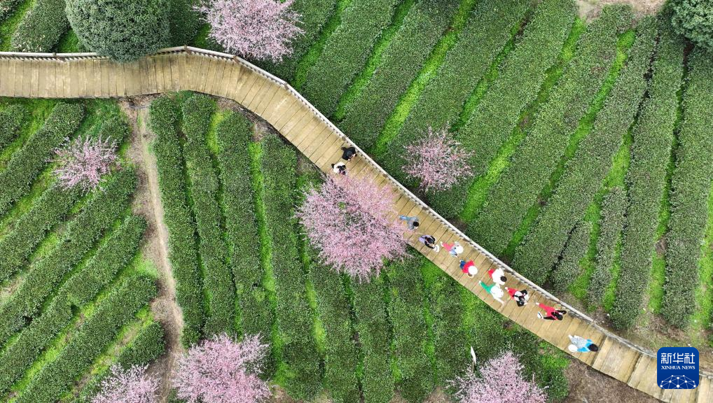 3月16日,游客在贵州省凤冈县永安镇田坝社区生态茶园基地游览(无人机照片)。新华社记者 杨楹 摄