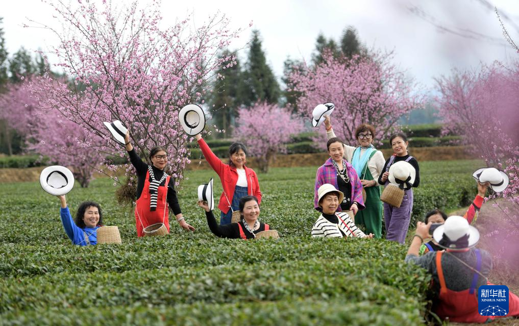 3月16日,茶农和体验采茶的游客在贵州省凤冈县永安镇田坝社区生态茶园基地采摘春茶。新华社记者 杨楹 摄