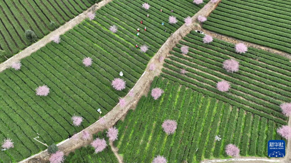 3月16日,茶农在贵州省凤冈县何坝街道一茶园采摘春茶(无人机照片)。新华社发(罗星汉 摄)