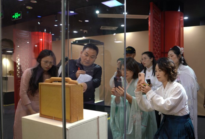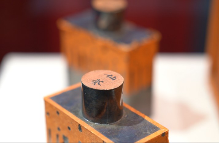 透过展陈玻璃,记者看到,“仙茶”包装匣由木质材制成,长约28厘米,宽约11厘米,高约27厘米。明黄色的绫布包裹住木匣内外,匣内有卧槽分置两罐银盒。在木匣顶部设有提手,十分精致,木匣盖面写有“仙茶”标识。