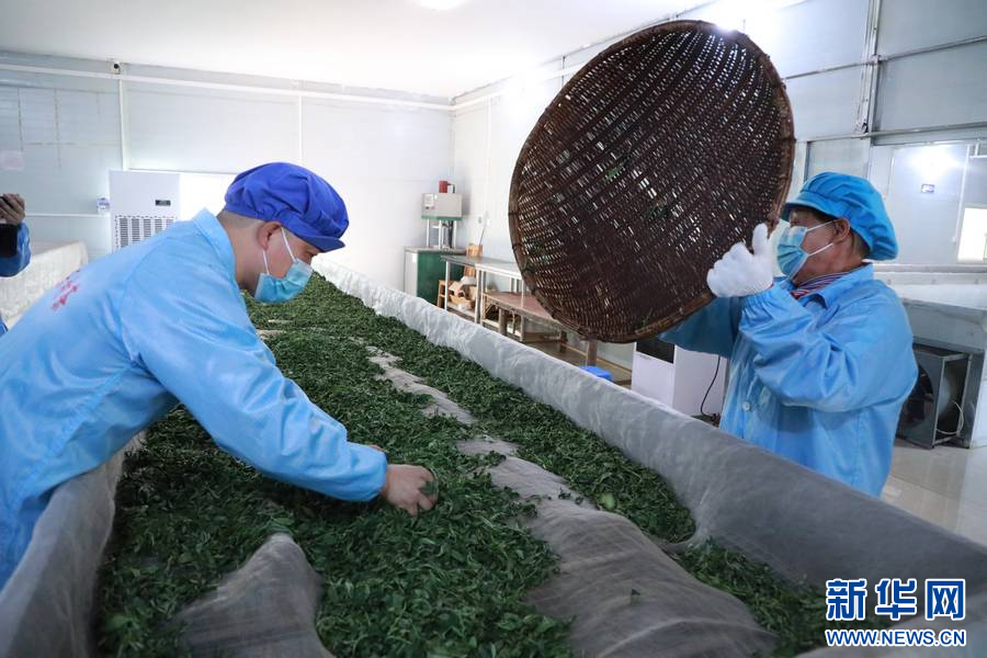 加工厂内,工人将茶叶铺开进行萎凋。罗俏摄