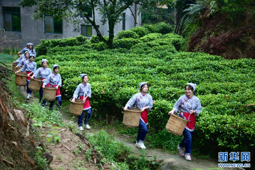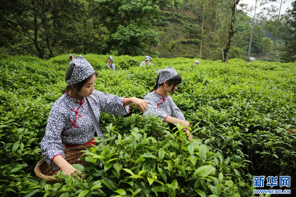 采茶女背着竹篓,穿梭在茶垄间,一捏、一提、一放,将 一片片鲜嫩的茶芽收入竹篓中,仿佛“指尖上的舞蹈”。新华网发(郑炯娜 摄)