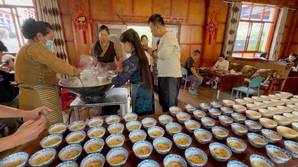 “目前店里纪录保持在147碗。”在纳西民族乡经营果拉丛农家乐的果拉卓玛说,“但生活再好也不能浪费。我们会提醒客人,如果吃饱了,只需用筷子在碗上搭出尖尖,就会停止加面;但对于不搭筷子的客人,我们还会再劝一碗。”
