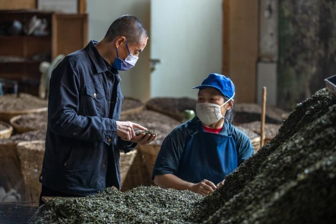 2022年11月24日,在四川省雅安市友谊茶叶有限公司的生产车间,甘玉祥(左)指导工人检查茶的品质。新华社记者 沈伯韩 摄