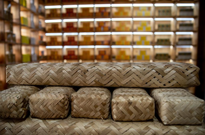 10月27日在四川省雅安市的雅安茶厂有限公司拍摄的装有藏茶茶饼的竹条包装,这种包装方式至今保留。新华社记者 储加音 摄