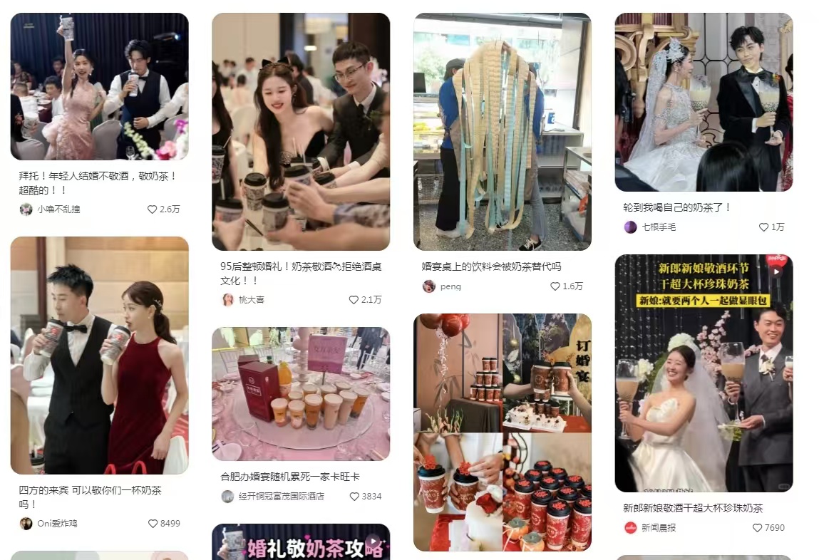 社交媒体上,在订婚宴、结婚宴上选择新茶饮作为待客酒水之一的帖子不在少数。其中,仅小红书平台“婚礼奶茶”话题中就有13万余篇笔记,热门笔记、视频等均有几万点赞与互动。