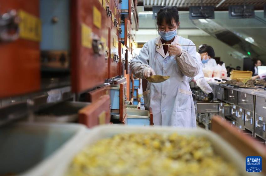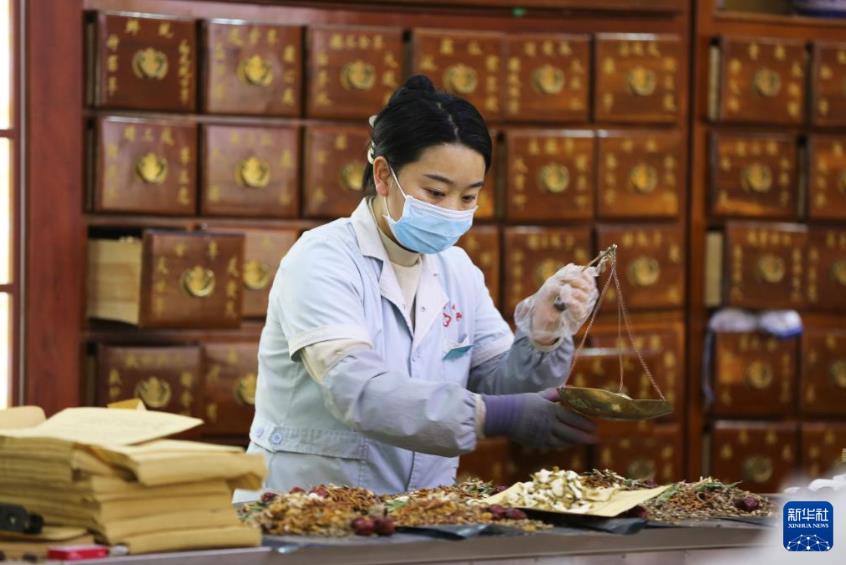 12月24日,在甘肃省定西市中医医院,工作人员在配药准备熬制茶汤。