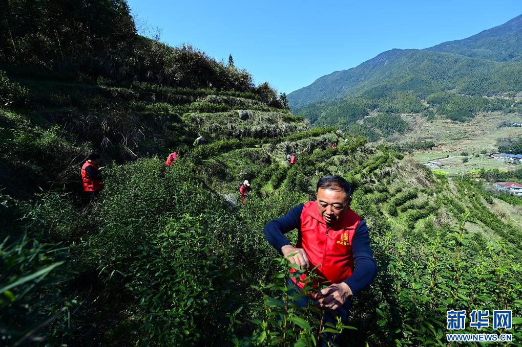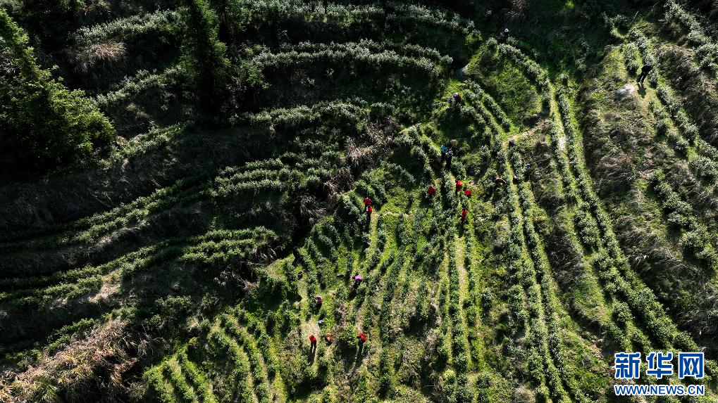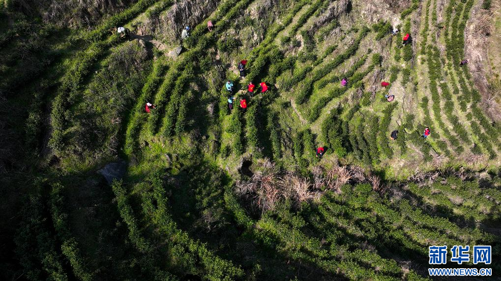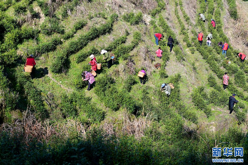 3月20日,江西省宜春市万载县茭湖乡上峰村邻里帮帮团成员和茶农一起采摘春茶。新华网发 邓龙华 摄