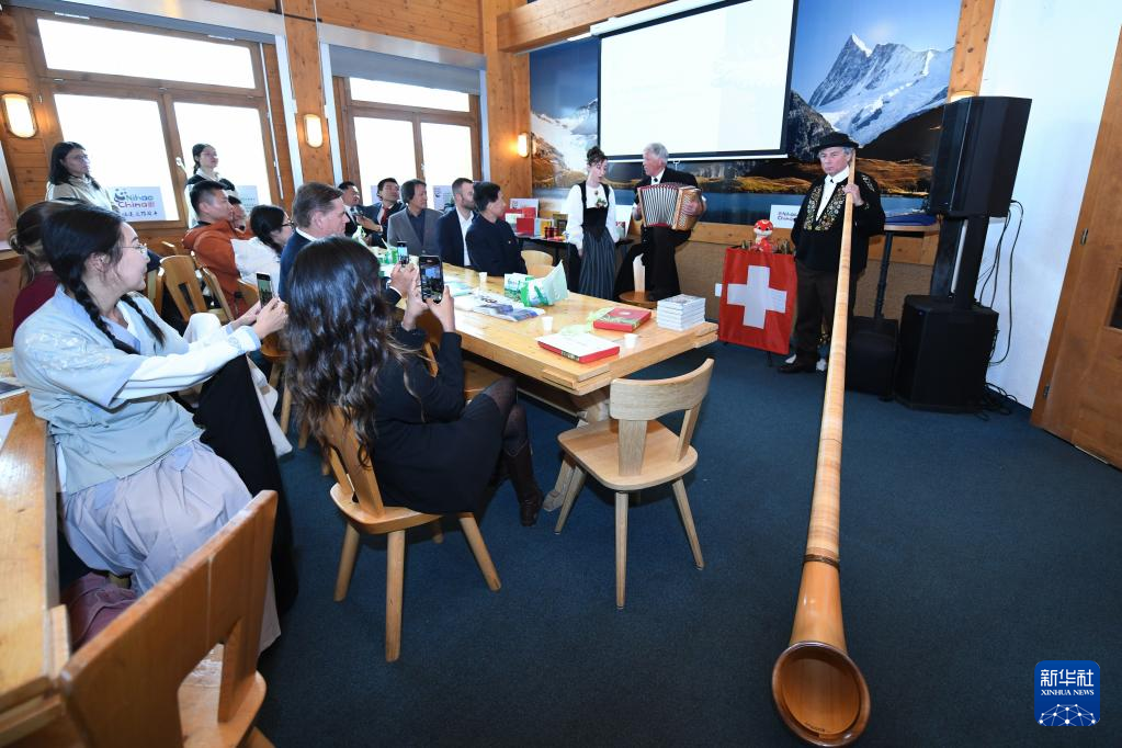 5月21日,嘉宾在瑞士伯尔尼州菲斯特山山顶举办的“茶和天下·雅集”活动上欣赏瑞士民俗音乐。新华社记者 连漪 摄